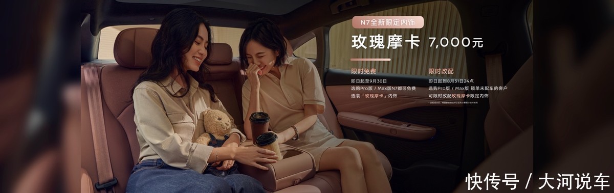 对于购买Pro版和Max版的N7用户,均可限时免费选装价值7000元的玫瑰摩卡内饰。不仅新用户,对老用户也考虑周到,对于已锁单且未配车的用户(Pro版/Max版)均可参与限时改配。不仅如此,备受消费者喜爱的副驾AI零压云毯座椅继续免费赠送。
