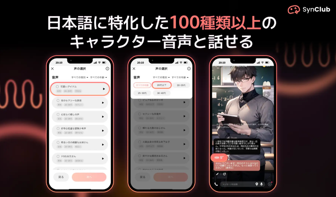 . 声音体验上的深度本地化。虽然 AI 语音已成为主流社交产品的标配,但「SynClub」的语音系统明显更为细腻,其为日本市场专门制作了 100 多种声音选项,涵盖不同年龄层、性格特征乃至方言(如关西腔),并在每次进入对话时自动播放背景音乐,显著提升了沉浸感;