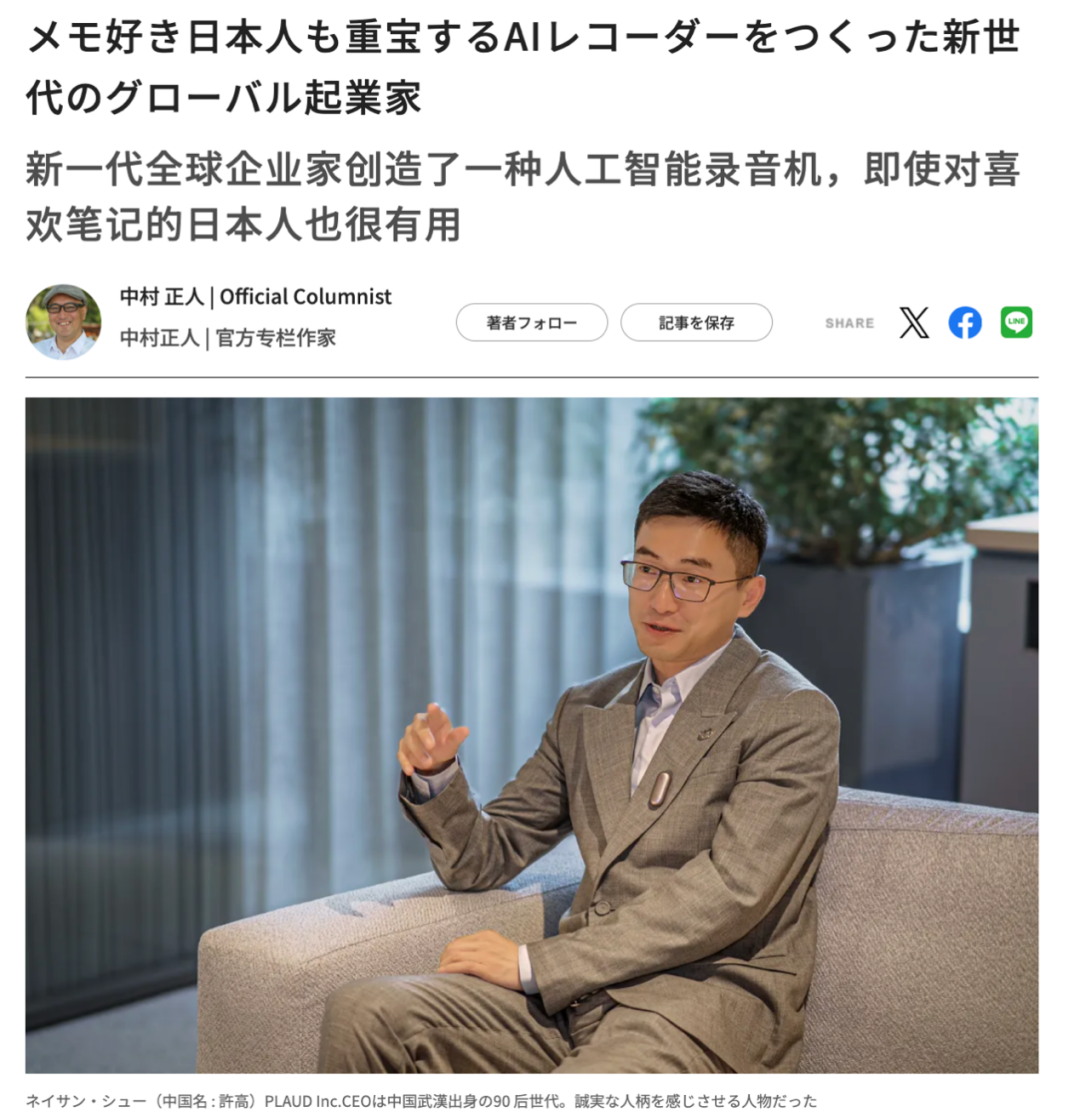 今年 5 月底,Plaud 联创许高与《福布斯日本》进行了对话,他说,“我们认为这款产品非常适合日本的职场文化,因为日本人有勤于做笔记和备忘的习惯。AI 录音机可以减轻这类任务对精力和注意力的负担。”