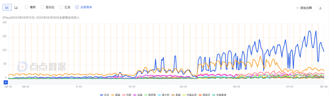 日本总务省 7 月发布的《信息通信白皮书》显示,日本个人用户的生成式 AI 采用率仅为 26.7%,只有中国(81.2%)的三分之一,也远低于美国(68.8%)和德国(59.2%)。但 Sensor Tower 公布的《State of AI Apps Report 2025》显示,日本用户悄然成为多款内购收入进入全球前列的 AI 应用的贡献主力:比如日本一直是 ChatGPT 的第二大收入市场,而出海 AI 录音产品「Plaud」正是凭借今年在日本市场的突飞猛进,一举闯入今年上半年全球 AI 应用内购收入 Top7,这也是唯一一款进入 Top10 的出海产品。
