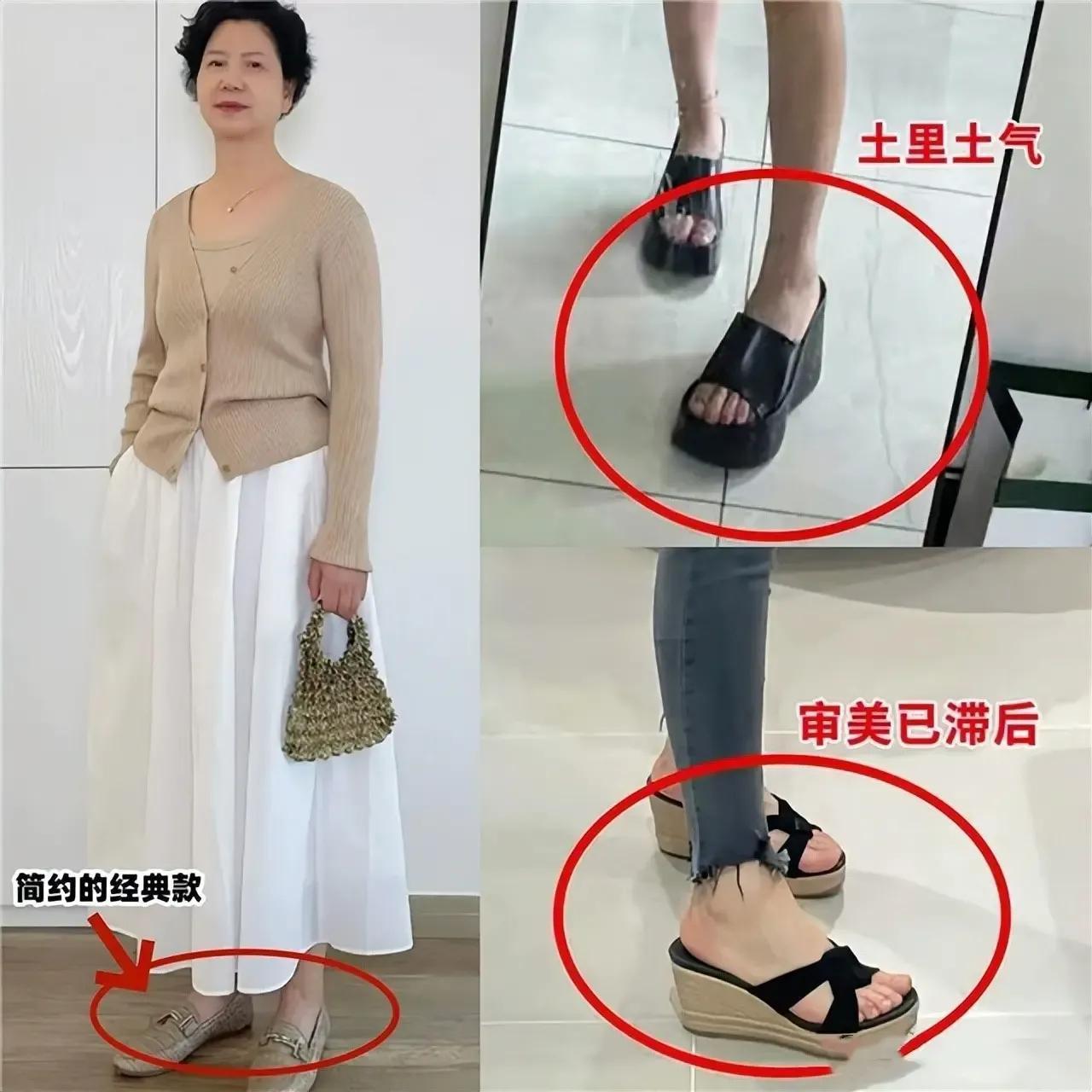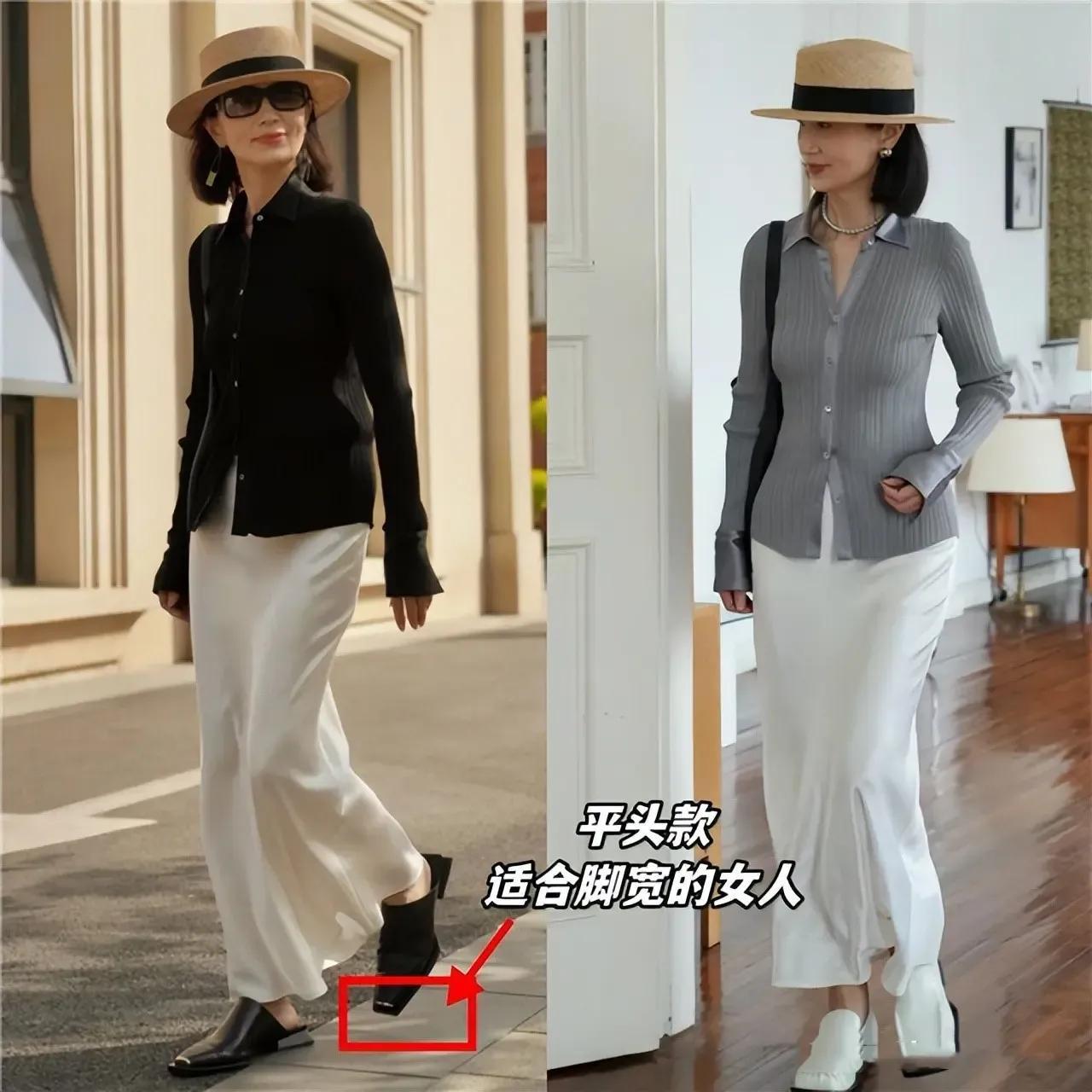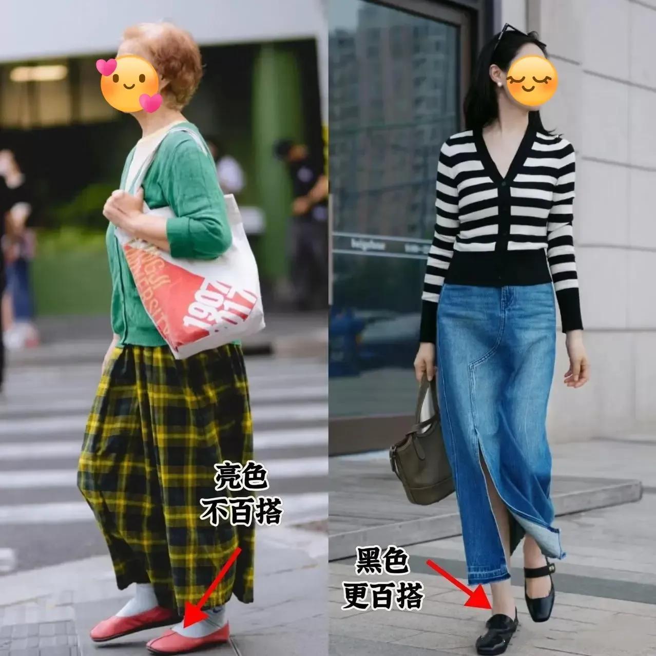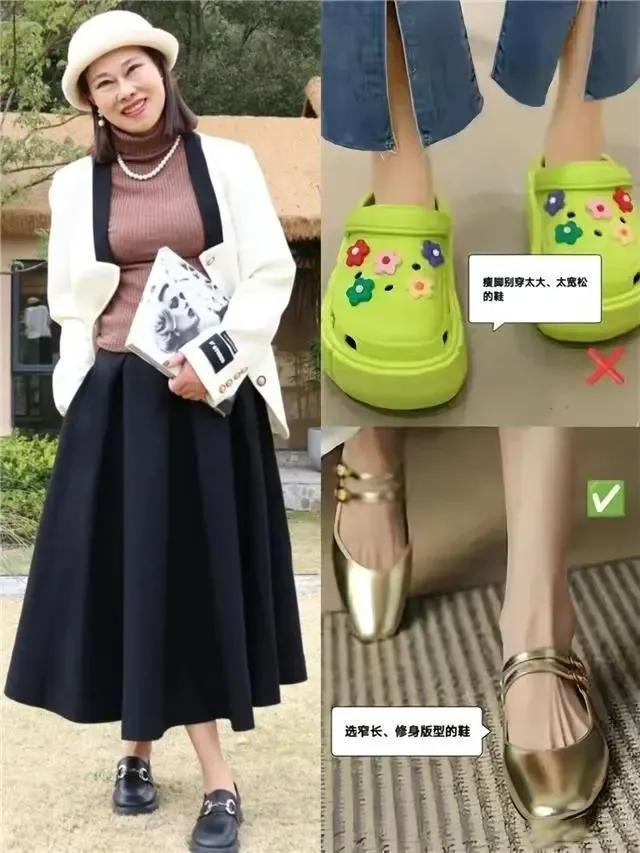 当然啦,不是说带跟的鞋子就好看,例如下面这双黑色的厚底鞋,这种鞋子虽然能给你身高增高,但是土里土气的,这种鞋子的审美已经滞后,我们应该选择简约款或者是经典款的平底单鞋,或者是浅口低跟单鞋,比如左边的这双乐福鞋就很大气,搭配上白色的半身裙和针织上衣,整个人优雅得体大方。
