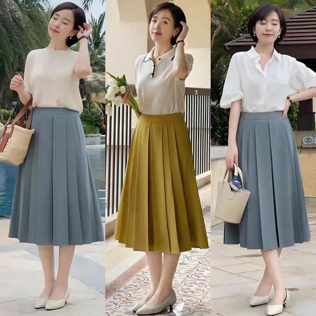 例如下面这位达人,选择白色的针织上衣或者是衬衫上衣,搭配上雾霾蓝的压褶半身裙和黄色的半身裙,脚上穿的就是一双米白色的羊皮材质,浅口单鞋,这一身穿搭精致时髦,而且显得减龄。
