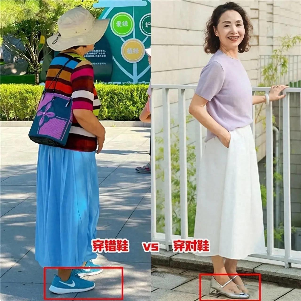 咱们就看下面这两位素人大妈的穿搭对比,同样是穿的一条半身裙,左边的这位选择浅蓝色的运动鞋,搭配上同色系的半身裙,还有彩色条纹的针织短袖,这样的穿搭配色,还有鞋子搭配是错的。