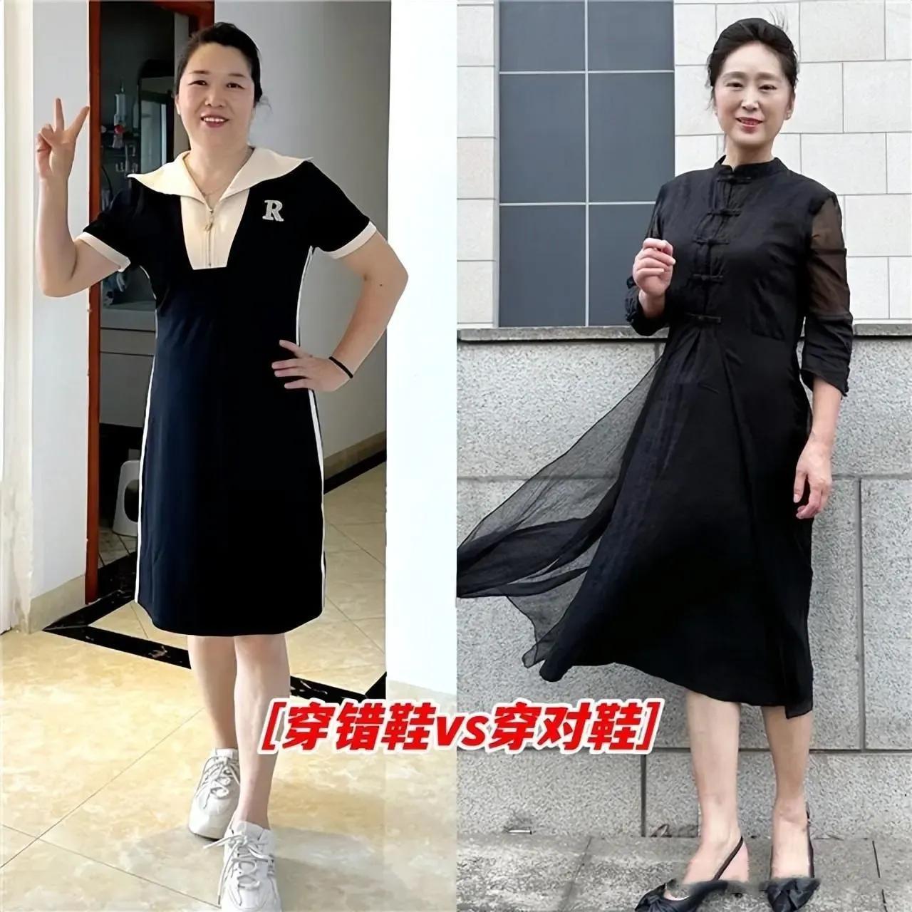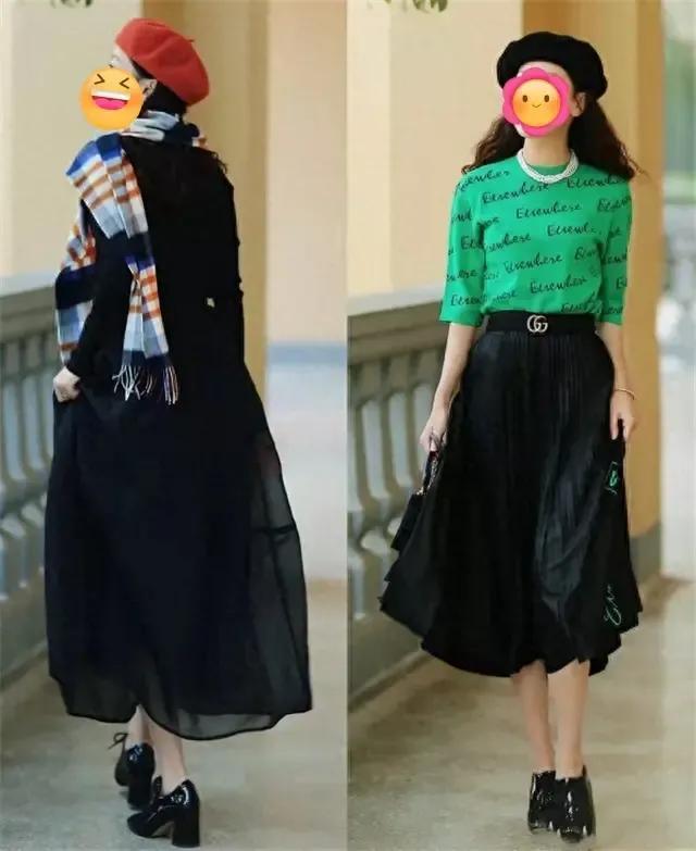 还不如右边的这一条黑色的薄纱连衣裙,搭配上黑色的浅口单鞋,这样的穿搭更大气,更有品质。